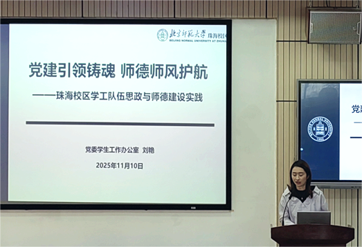 11月10日,“同心同行同力——共绘师德建设新篇章”2025年教师思政工作联络员培训交流会在木铎楼A215报告厅顺利举行,珠海校区党委副书记孔毅出席会议,全体教师思政工作联络员参会,会议由党委教师工作办公室副主任覃炜斐主持。