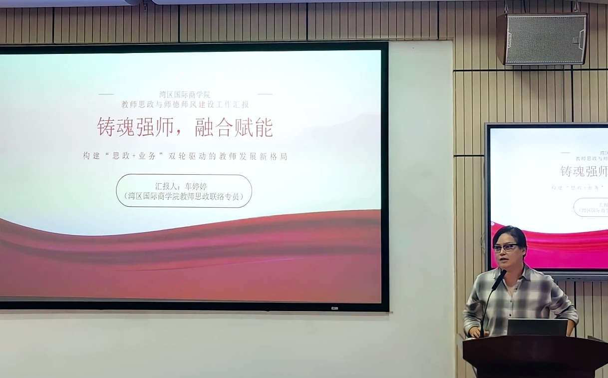 湾区国际商学院车婷婷老师总结“思政+业务”双轮驱动的教师发展新格局。学院有效破解思政工作与教学科研业务“两张皮”难题;以课堂为主阵地,由院领导带队巡课听课,重点考察教师课堂言行、精神风貌及课程思政融入实效;将教师职业行为准则与典型案例汇编成口袋册,发放给全体教师,方便随时学习、常学常悟。